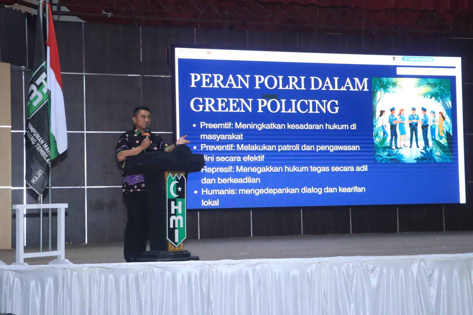 Ia menjelaskan bahwa konsep Green Policing menempatkan alam sebagai amanah yang harus dijaga bersama. Polri, lanjutnya, berperan dalam meningkatkan kesadaran hukum masyarakat, melaksanakan patroli dan pengawasan dini secara efektif, serta menegakkan hukum secara tegas, adil, dan berkeadilan terhadap pelanggaran lingkungan.