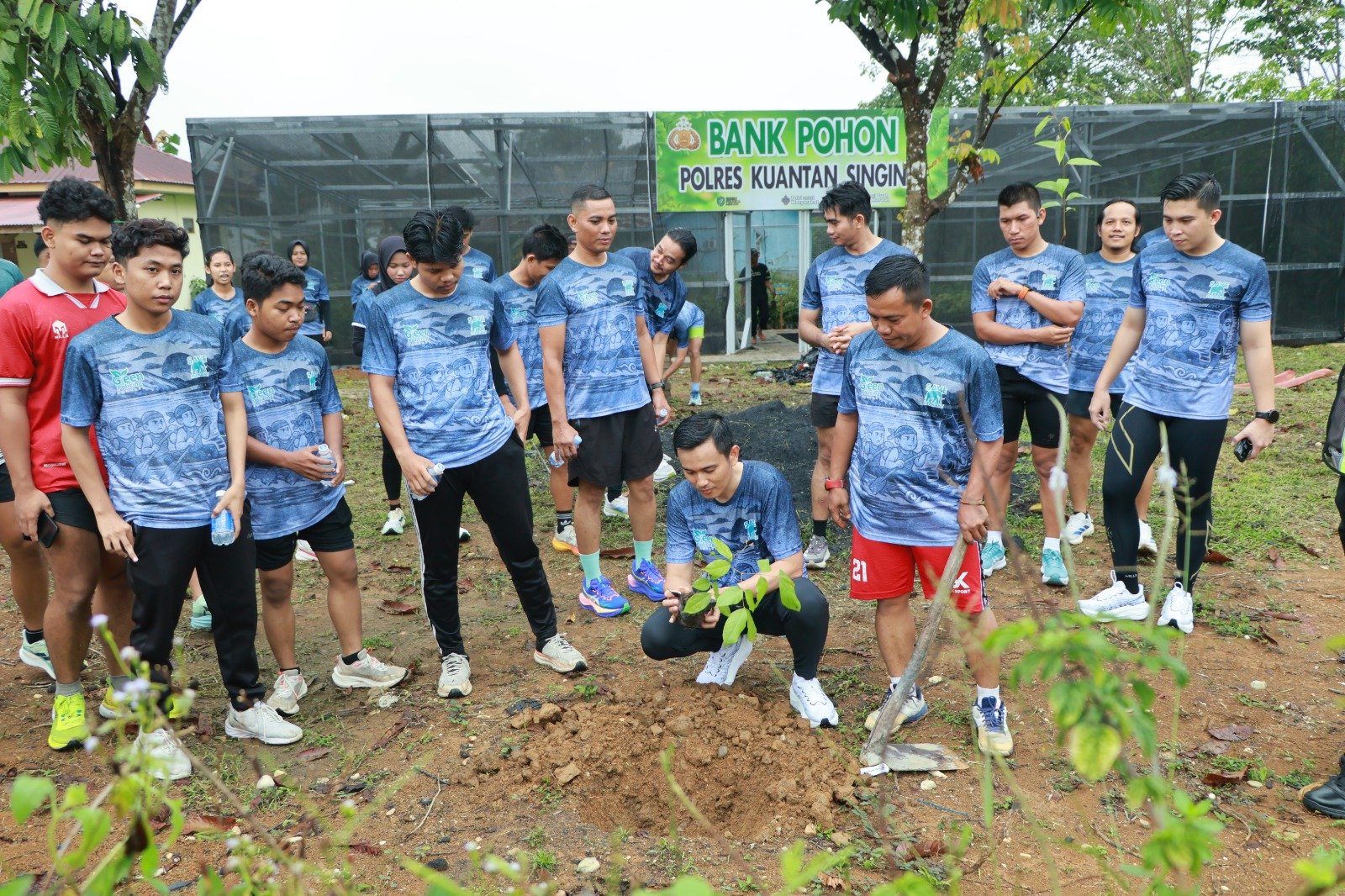 Kegiatan dilanjutkan dengan aksi penanaman pohon di Bank Pohon Asrama Polisi Polres Kuansing sebagai bentuk kepedulian terhadap kelestarian lingkungan.