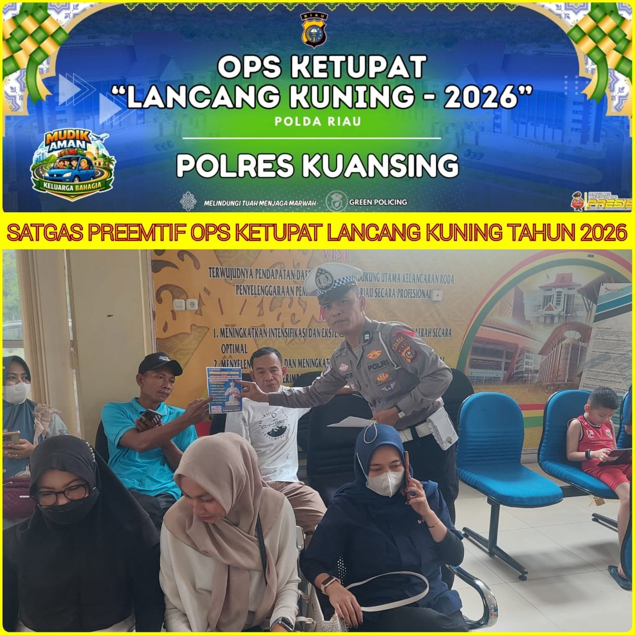 Kegiatan tersebut dilaksanakan dalam rangka Operasi Ketupat Lancang Kuning 2026 dengan memberikan himbauan tertib berlalu lintas, tips mudik Lebaran yang aman, serta pembagian brosur dan leaflet kepada masyarakat yang sedang mengurus administrasi kendaraan.